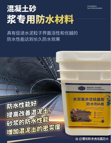 水泥基渗透结晶型防水剂(A类)是掺和在混凝土、砂浆中使用的专用防水材料,具有促进水泥粒子界面活性和优越的防水性能,在和水泥、水的化学反应中吸收氢氧化钙,反应生成硅酸钙胶体,填塞了水与空气所占的空隙部分,形成自愈性能,增加了混凝土的密实度,使混凝土产生自身躯体结构防水和微裂缝修复,达到长久防水效果。